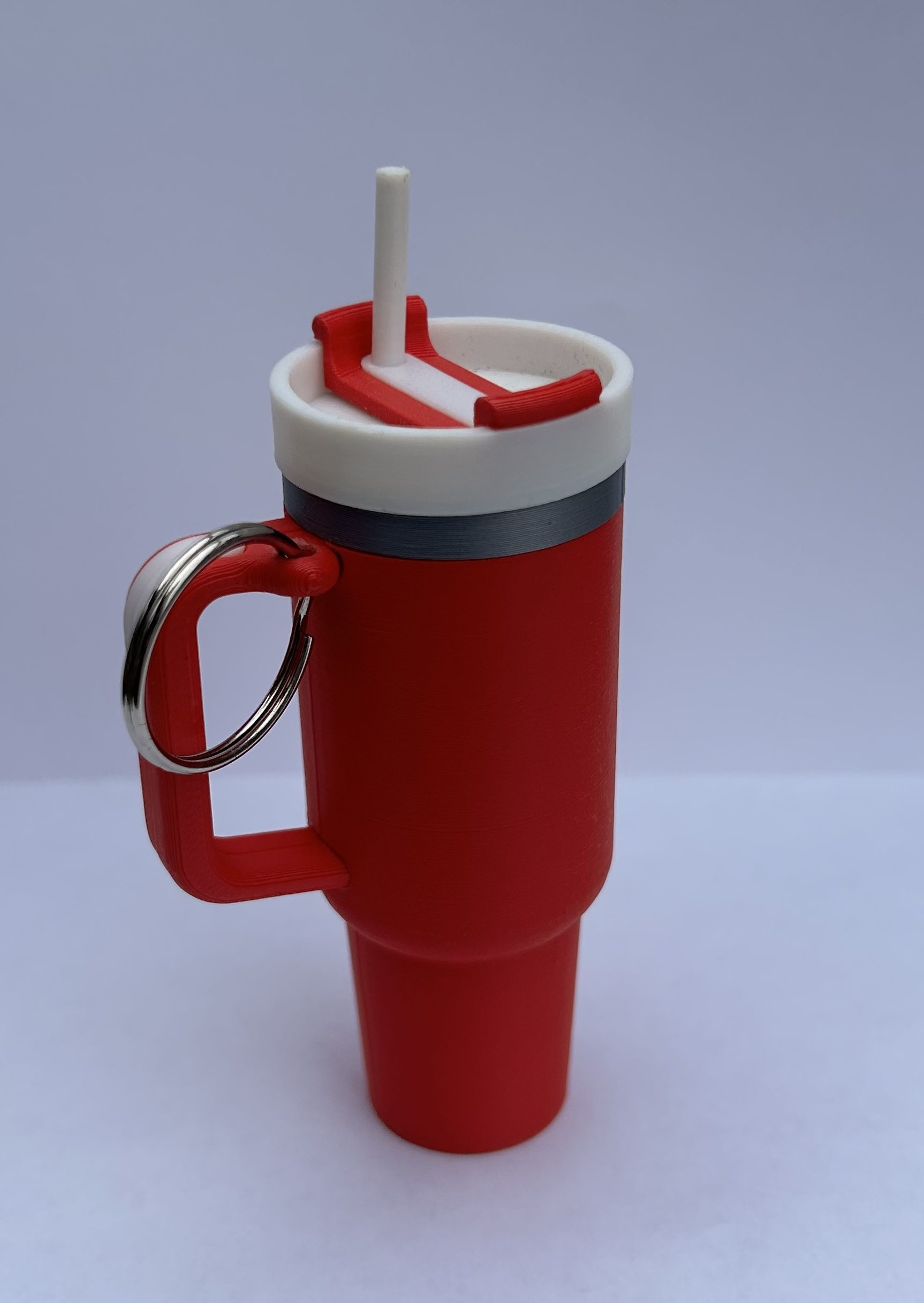 Keychain designed to mimic the shape of popular insulated travel cups. Holds a single lip balm tube and is available in many colors.